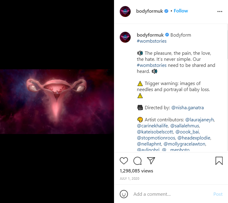 Bodyform is a brand that smashes taboos, raises awareness and encourages creativity. In July 2020, this year, we launched #wombstories across social – a campaign which celebrates and encompasses the wide range of menstrual phases we can go through in a lifetime i.e. first periods, post-pregnancy periods, menopause, endometriosis, PCOS, no periods, period sex, IVF treatment etc.