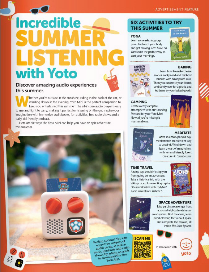 Full page advertorial for Yoto in The Week Junior magazine, July 2023.